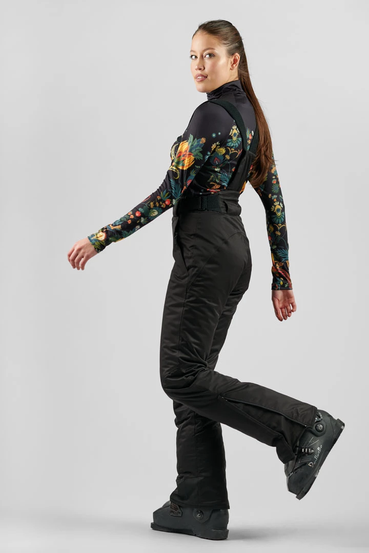 Конструктив брюк отвечает всем запросам активной спортсменки – карманы на молнии, вентиляционные продувы с внутренней стороны бедер, высокая спинка, отстегивающиеся плоские бретели из широкой плотной резинки. Укрепленный низ брючин предотвращает порезы кантами, а раструб на молнии облегчает вход в горнолыжный ботинок.